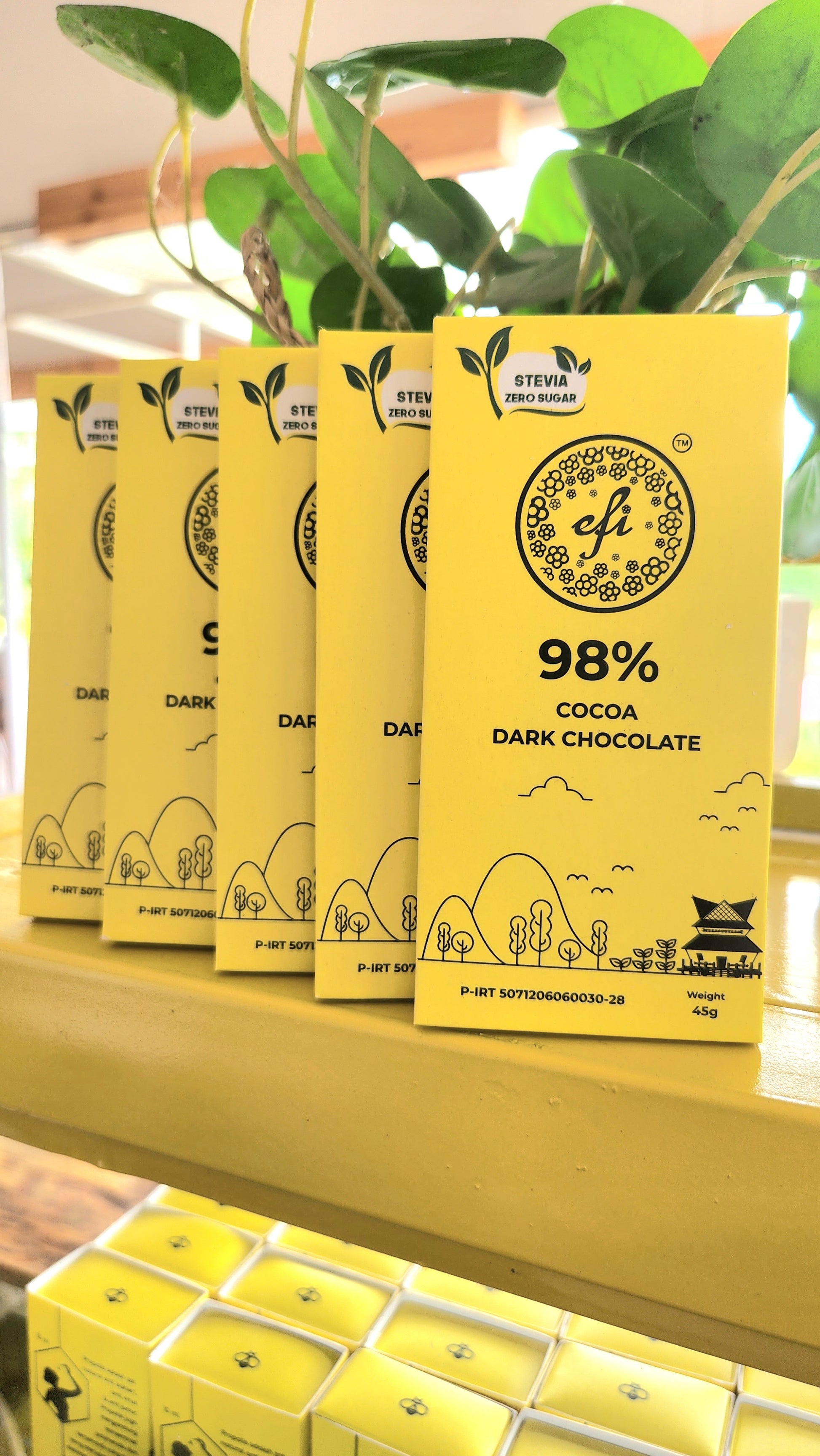 Efi Chocolate menghadirkan kenikmatan tak tertandingi dengan 98% dark chocolate dan pemanis alami stevia, tanpa tambahan gula. Dari tanah Karo yang subur, biji coklat pilihan diolah dengan hati-hati untuk menciptakan kelezatan mewah ini. Setiap gigitan menghadirkan aroma kuat dan rasa cokelat pahit yang kaya, disempurnakan dengan sentuhan manis alami dari stevia.